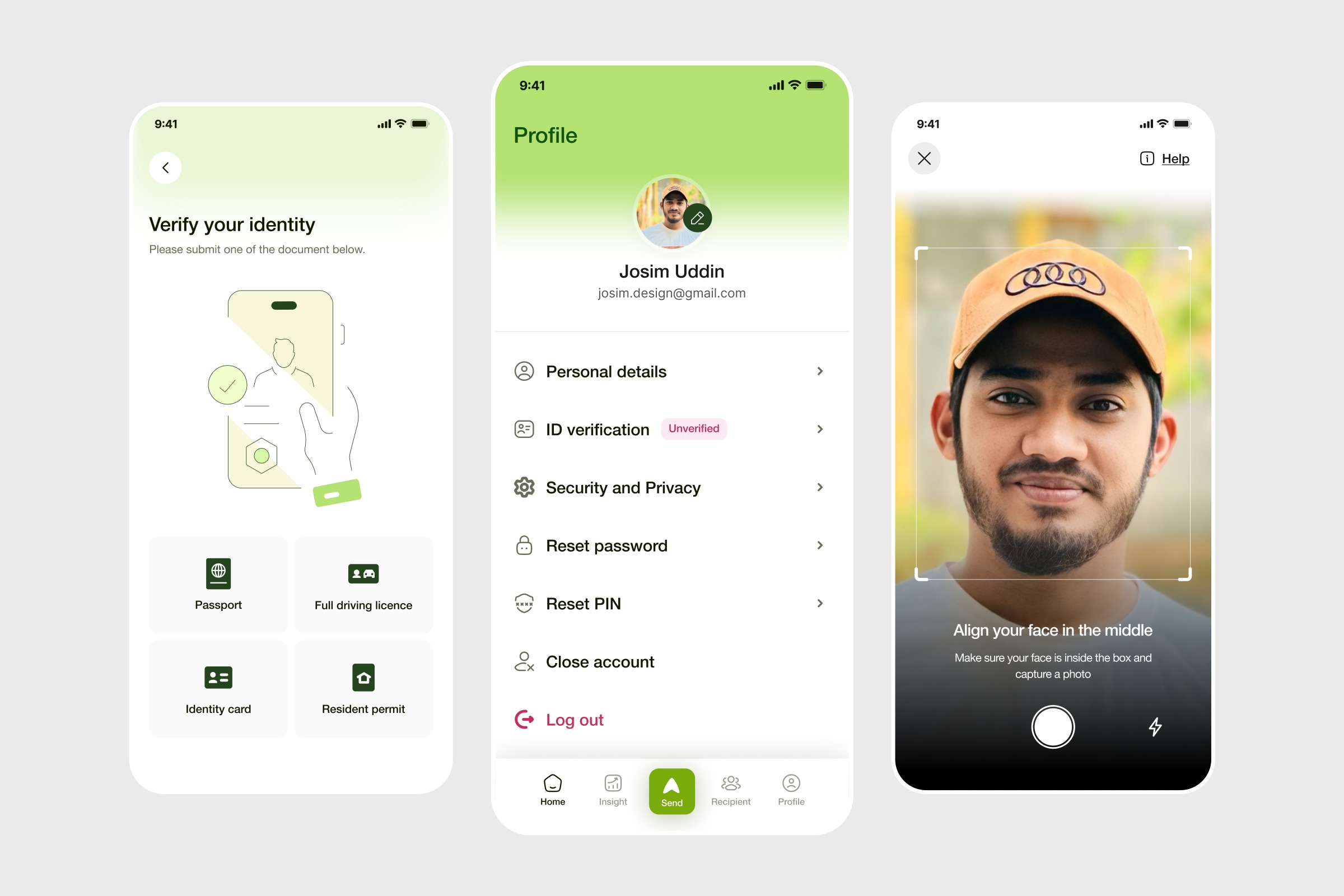 Designed a KYC (Know Your Customer) verification flow focused on balancing security with a smooth user experience. The goal was to make identity verification feel less complex and more guided. From document selection to face capture, each step is structured to reduce friction while maintaining user trust. Key design decisions: • Step-by-step verification flow for clarity • Clean UI with soft visuals to reduce user anxiety • Clear document selection options for quick action • Real-time face capture guidance for better accuracy • Structured profile section for easy account management This design focuses on creating a seamless and secure onboarding experience while keeping the interface intuitive and human-centered. 📩 hellozainstudio.craft@gmail.com