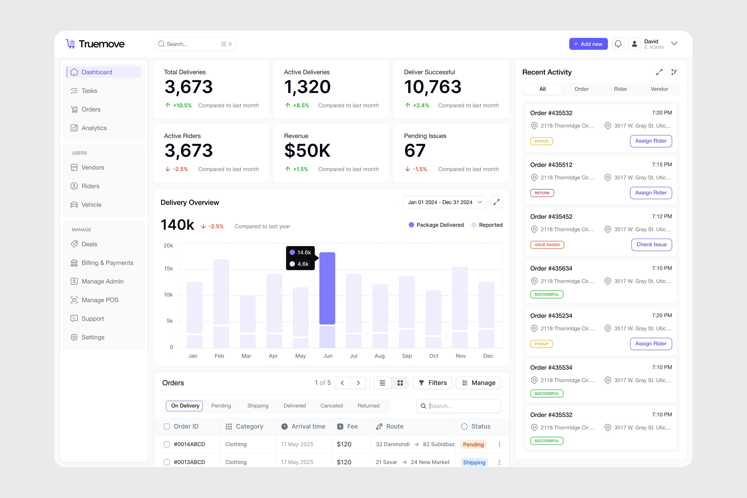 Logistics & Delivery Management Dashboard UI Logistics platforms require quick decision-making and real-time visibility. This delivery management dashboard is designed to help teams monitor deliveries, track rider activity, and manage orders from one centralized interface. The layout highlights key metrics such as total deliveries, active riders, revenue, and pending issues, allowing managers to instantly understand operational performance. A visual delivery overview chart provides quick insights into monthly trends, while the order table helps teams track shipment status and routes efficiently. Design Approach: The goal was to create a clean and data-focused interface that simplifies complex logistics operations. Clear visual hierarchy, structured cards, and organized activity feeds allow users to scan information quickly and take action when needed. A well-designed dashboard can turn complex delivery operations into clear, actionable insights. 📩 Let’s collaborate: hellozainstudio.craft@gmail.com