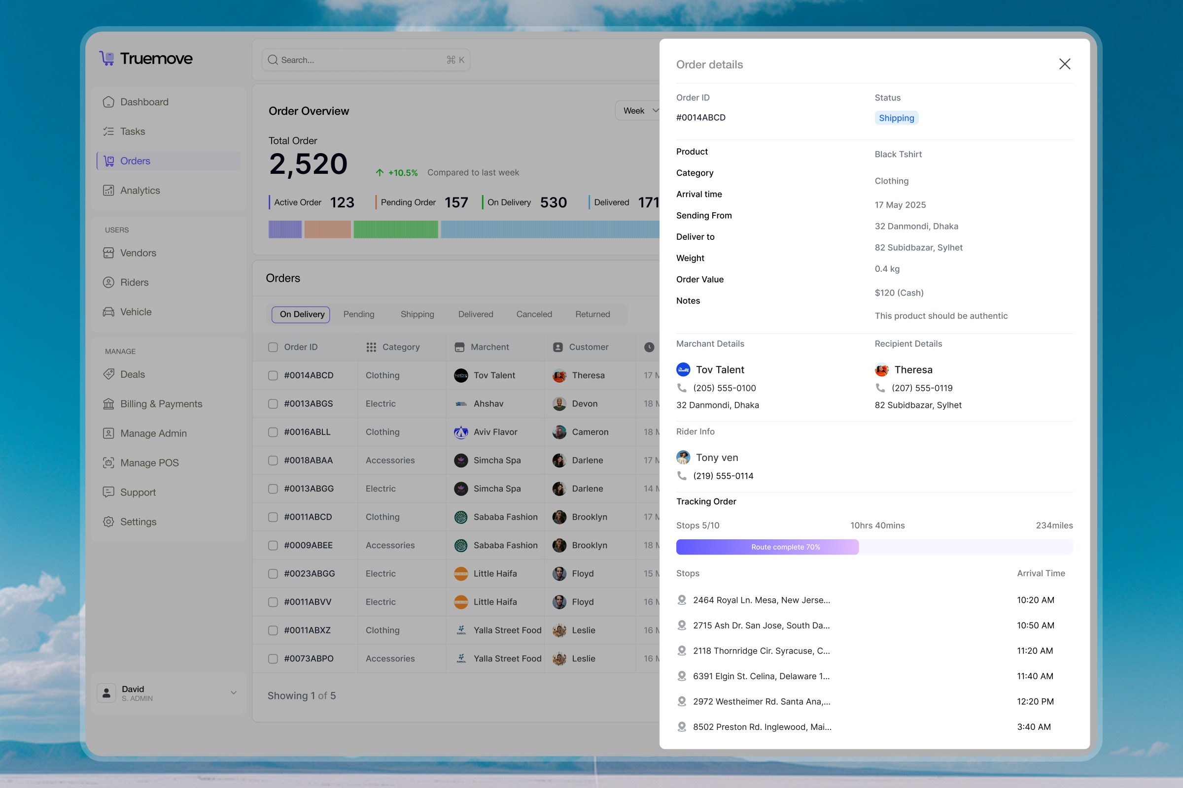 Logistics teams often need quick access to detailed order information without disrupting their workflow. This design introduces a slide-over order details panel that allows managers to review shipment data instantly while keeping the main order table visible. The interface clearly organizes order status, product details, merchant and recipient information, rider assignment, and route tracking in one structured view. A visual progress indicator and stop-by-stop delivery list help teams quickly understand shipment progress and operational status. Design Approach: The goal was to simplify complex logistics data into a clean, scannable layout. The side-panel interaction keeps context intact while providing deep order insights, allowing teams to review details and make faster decisions without navigating away from the dashboard. 📩 Let’s collaborate: hellozainstudio.craft@gmail.com