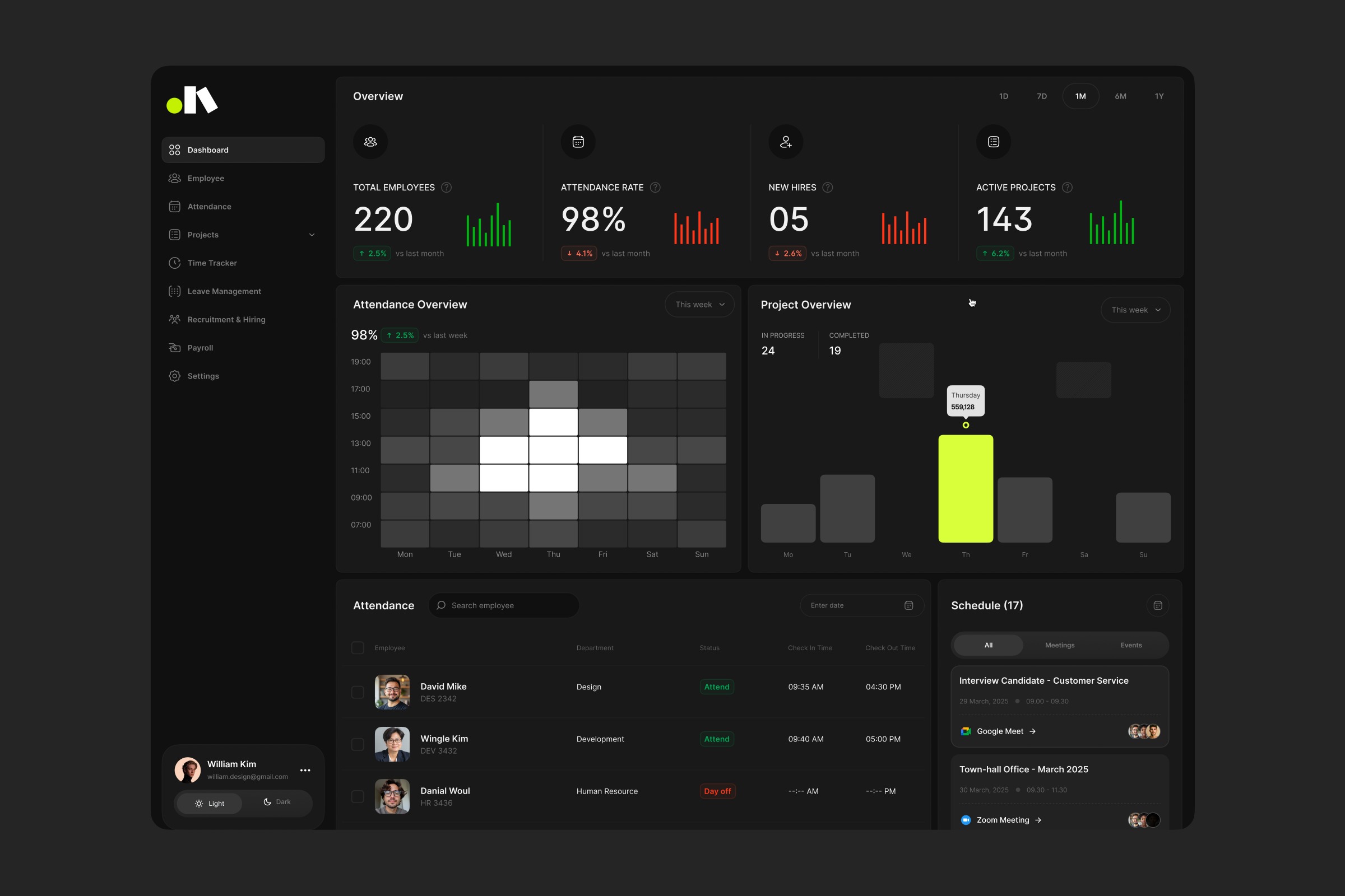 Modern HR & Employee Management Dashboard UI What if management felt effortless? Visit Us: https://zaindesignstudio.com/ Designed with a clean dark interface and high-contrast visuals, this HR & employee management dashboard focuses on clarity, usability, and performance. From attendance tracking to project insights, every section is structured to improve workflow and decision-making. ✨ Key Highlights: • Smart data visualization • Real-time attendance & project overview • Minimal dark UI with neon accent • User-friendly navigation • Performance-focused layout Good design doesn’t just look modern — it makes management effortless. Let’s build impactful digital products together. 📩 hellozainstudio.craft@gmail.com #UIUXDesign #DashboardDesign #HRDashboard #ProductDesign #UXDesign #UIDesign #SaaSDesign #WebAppDesign #UserExperience #DesignAgency