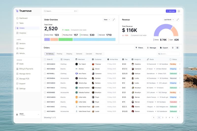 Managing logistics operations requires clear visibility across orders, revenue, and delivery performance. This order management dashboard is designed to help teams monitor operational data quickly and make faster decisions. The interface highlights total orders, delivery status distribution, and revenue insights in one centralized view. Managers can easily track order progress, analyze weekly performance, and review assigned riders and routes through a structured data table. Design Approach: The goal was to simplify complex operational data into a clean and easy-to-scan layout. By combining visual summaries with detailed order tables, the dashboard supports both quick insights and deeper operational control. Clear hierarchy, organized filters, and simple analytics components help teams manage logistics workflows more efficiently. 📩 Let’s collaborate: hellozainstudio.craft@gmail.com