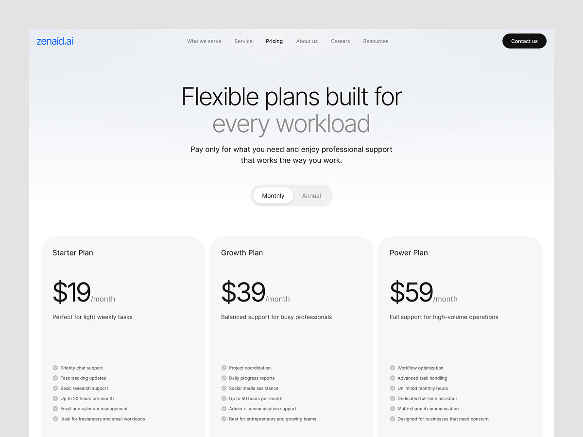 Exploring a clean and modern pricing experience for a Virtual Assistant website where the goal was to create a clear, flexible, and user-friendly layout that instantly communicates value through three structured plans (Starter, Growth, and Power), supported by a soft minimal UI, balanced typography, subtle shadows, and a smooth monthly/annual toggle to enhance usability, while each card is designed to highlight scalability, from light task support to full operational assistance, ensuring that users can quickly understand what they get at every level and confidently choose the plan that fits their workflow.