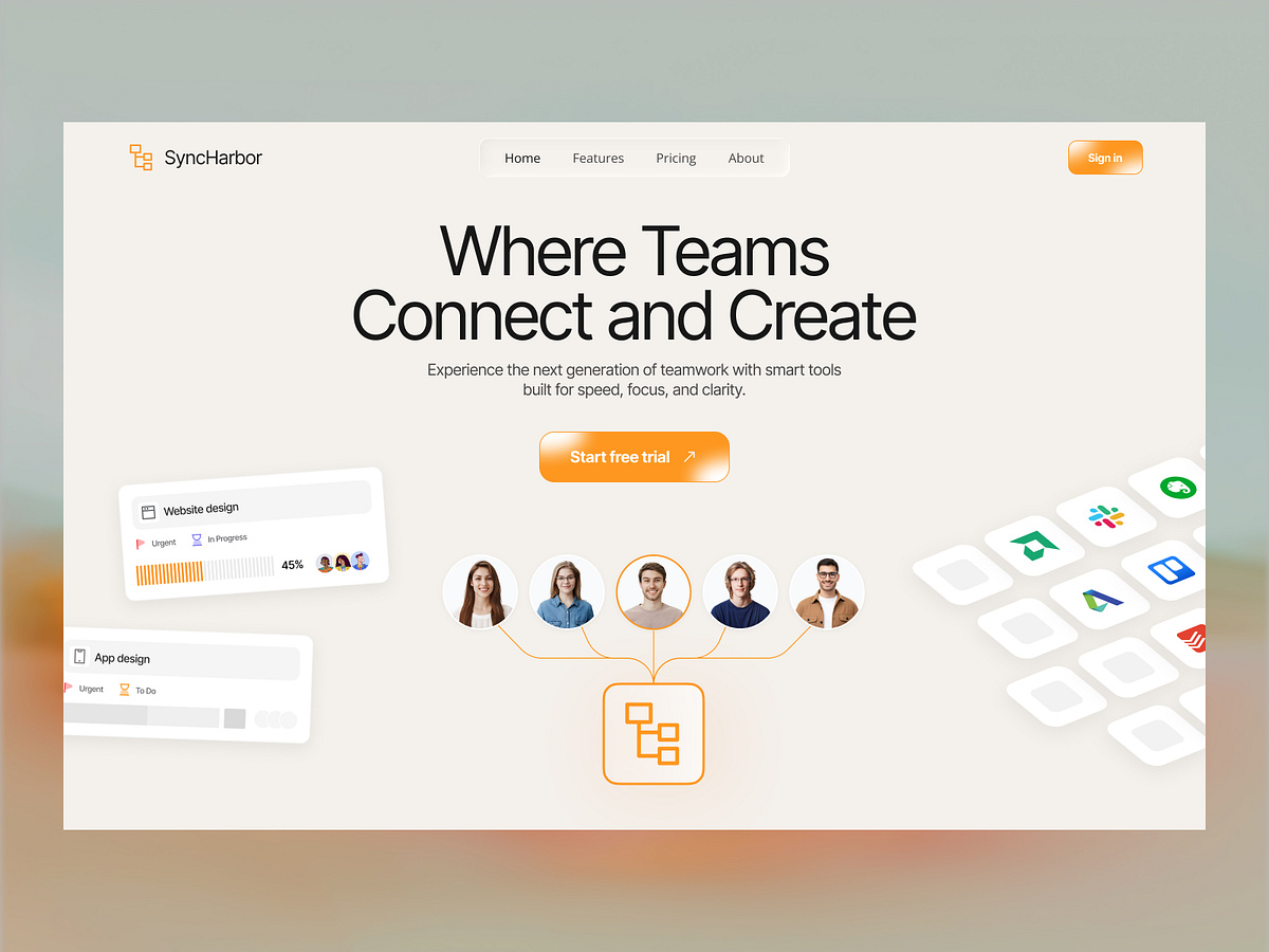 Team Collaboration Website Design Concept crafted with a modern and minimal style to help teams communicate better, manage workflows faster, and stay connected in one smart platform, featuring a clean hero section with bold messaging and strong call-to-action, collaboration-focused visuals, productivity stats to build trust, feature showcase cards for real-time teamwork tools, integration sections for connected workflows, simple and attractive pricing plans for easy decisions, testimonial areas for credibility, and a fully user-friendly layout designed to deliver a smooth experience across devices, with the main goal of creating a professional, efficient, and visually engaging SaaS website that empowers remote and growing teams to achieve more together through thoughtful UI/UX design created in Figma.