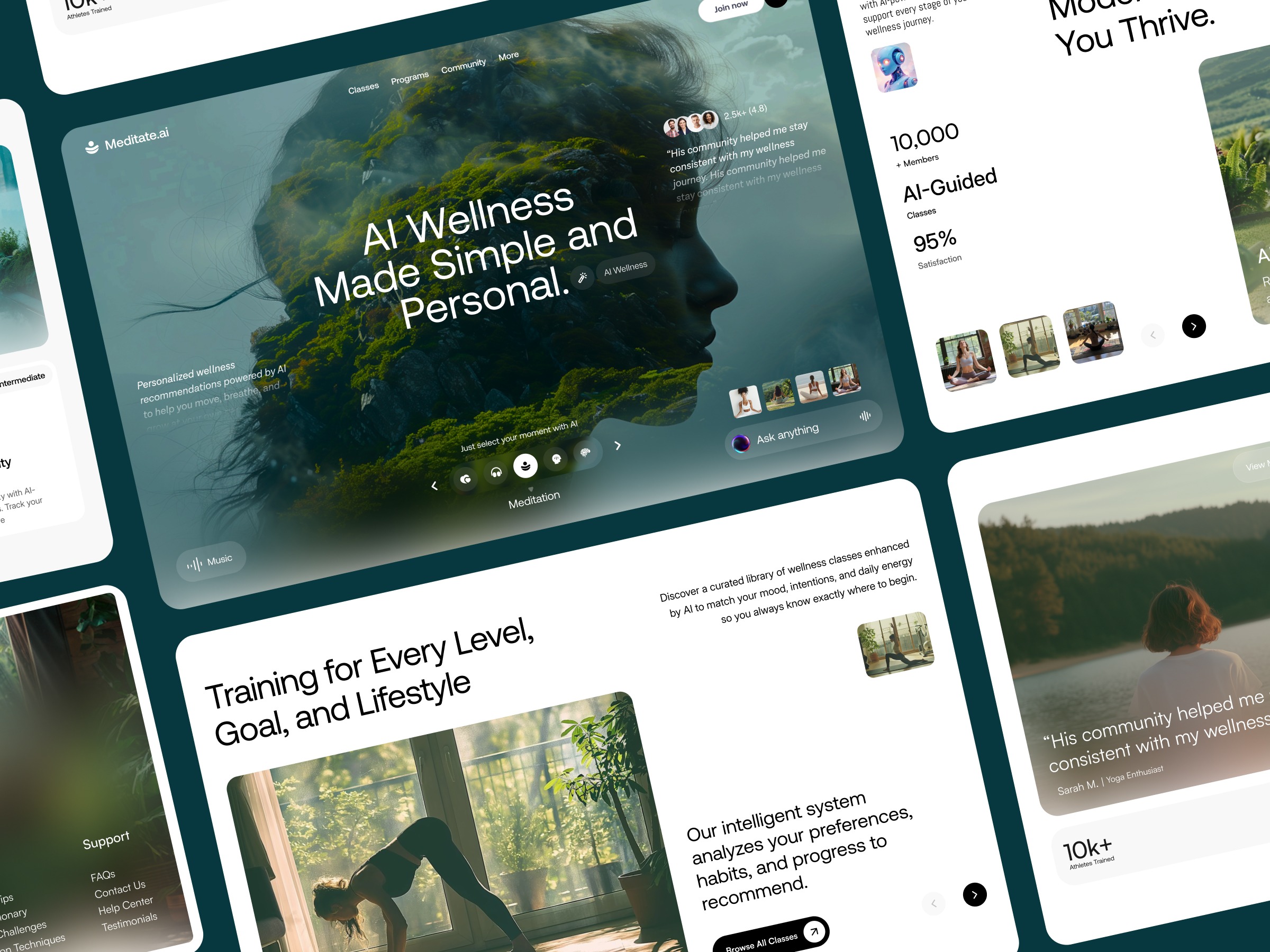 Summary Designed a modern, AI-powered wellness platform that delivers personalized well-being experiences, including guided meditation, mindfulness tracking, and tailored wellness programs. The goal was to create a clean, intuitive, and responsive interface that helps users practice mindfulness, manage stress, and track progress seamlessly. Problems Identified Users struggle because: Generic wellness programs don’t match personal needs or mood Different apps are required for meditation, fitness, and tracking No clear guidance for beginners to start a routine A lack of emotional connection makes consistency difficult There’s no AI assistance to answer wellness questions instantly Content feels scattered and overwhelming Wellness platforms often look outdated or cluttered Users need structure but also flexibility and personalization Solutions Implemented This platform solves the issues by offering: AI-powered suggestions tailored to mood, intentions, and lifestyle A unified hub for meditation, classes, programs, and community Mood selector (“Select Your Moment”) for instant personalized choices Tailored programs (14–30–60 days) that adapt to user level Guided meditation, yoga, and Pilates taught by expert instructors Progress tracking to encourage daily consistency Real community support with stories, reviews, and shared journeys Soft minimalist UI that feels calm, modern, and emotionally warm Intelligent onboarding that learns from user behavior A responsive, mobile-friendly experience for practice anywhere